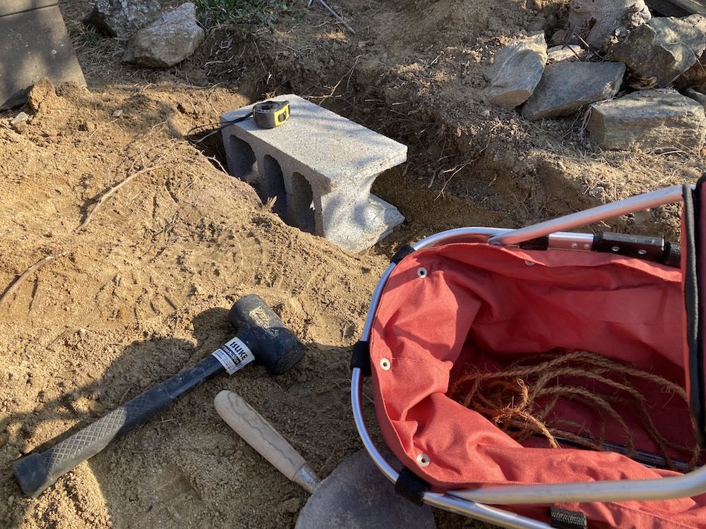 基礎といっても大げさなものはできないので、地固めをしてブロックを置き、その上に柱を建てる予定です。